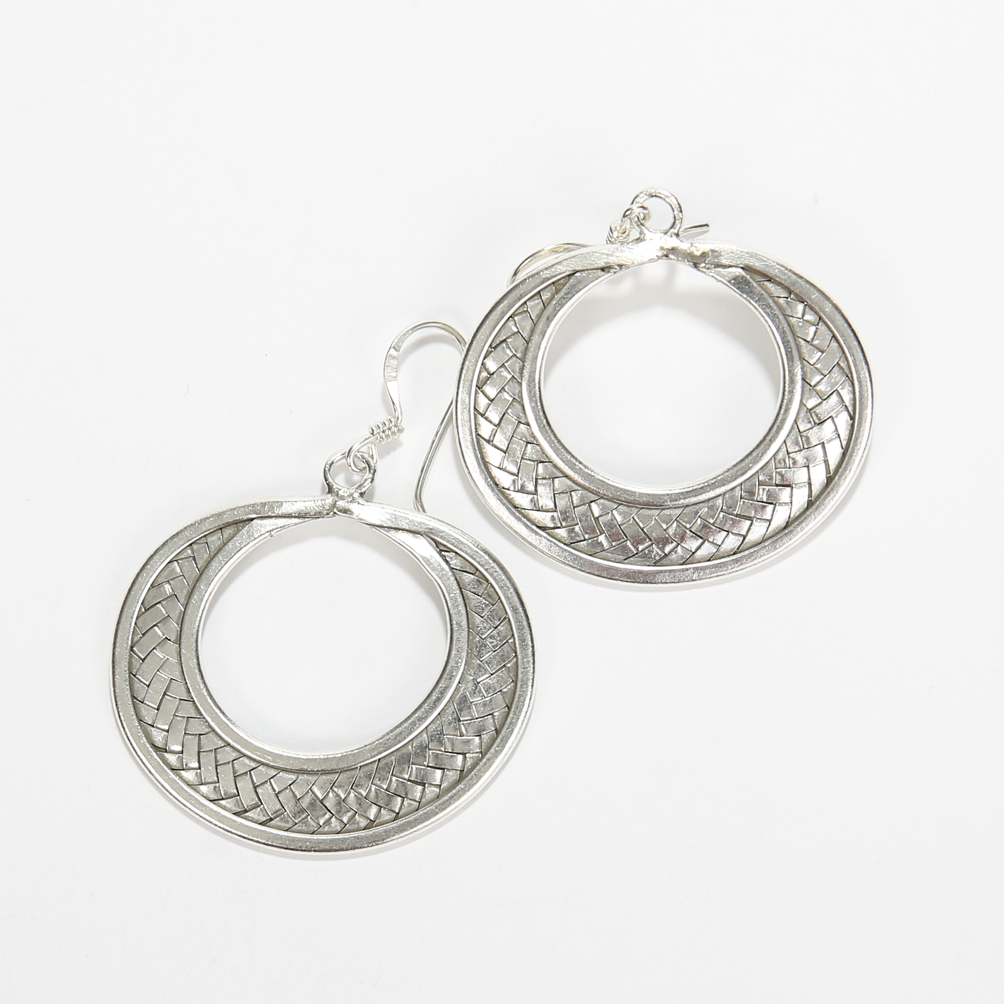 A larger, more dramatic take on the Imperia woven crescent — wide circular hoops wrapped in an intricate braid of fine silver. The texture is rich and dimensional, catching the light with every movement and giving the earrings a powerful handcrafted presence. Their generous size makes them a statement on their own, perfect with swept-back hair, strong silhouettes, and minimal outfits that let the woven work shine. Bold, elegant, and unmistakably artisanal — a centerpiece earring for anyone who loves refined drama.