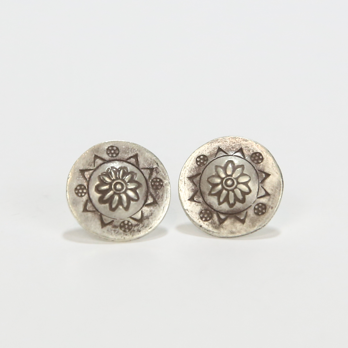 Circular fine-silver studs engraved with a radiant floral sun — a symbol of renewal, clarity, and rising into your own power. The outer ring is textured with tiny dotted accents and angular rays, giving the piece an old-world mystic feel while keeping a clean, modern shape. These are the kind of studs that brighten the face instantly. They work beautifully with loose hair, layered necklaces, or a soft, minimal outfit that lets the engraved details speak. Warm, symbolic, and effortlessly wearable — a small reminder to keep your light on, even on quiet days.