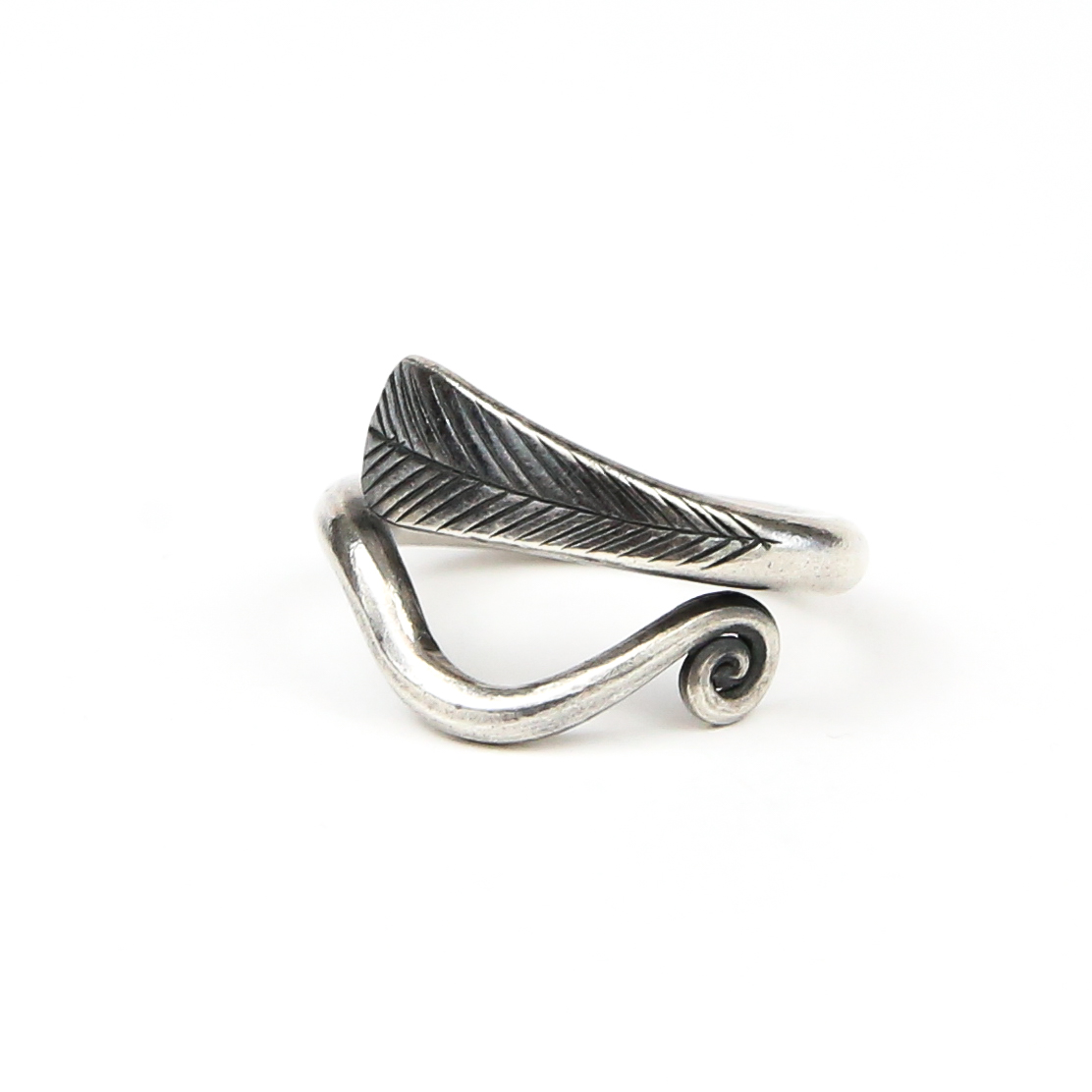 A sculptural swirl meets an engraved leaf tip — movement, transformation, and calm strength in fine silver.